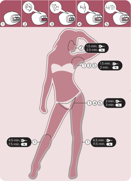 Damit Philips Lumea effektiv funktioniert, ist es wichtig, dass Sie bei der Behandlung Ihrer Haut mit Philips Lumea alle Hautpartien berücksichtigen und keine Bereiche auslassen. Achten Sie jedoch darauf, dass Sie dieselbe Partie nicht mehr als einmal behandeln, da dies zu Hautreizungen führen kann.